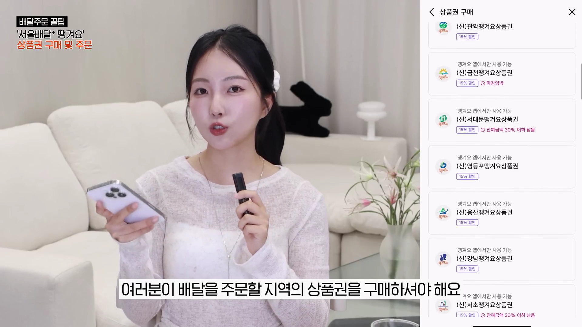 - 배달을 주문할 지역의 상품권을 구매합니다. (예: 용산 땡겨요, 서대문 땡겨요)