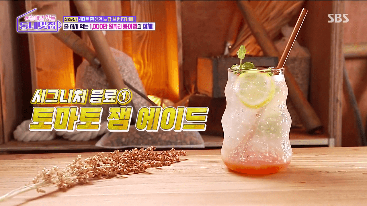 붕어빵과 함께 카페의 수익을 견인하는 또 다른 아이템은 시그니처 음료입니다. 특히 어머니의 시그니처였던 '토마토 잼'을 활용한 아이디어가 돋보입니다. 이 아이디어의 장점과 정보를 가장 잘 느껴지도록 설명해 드릴게요.