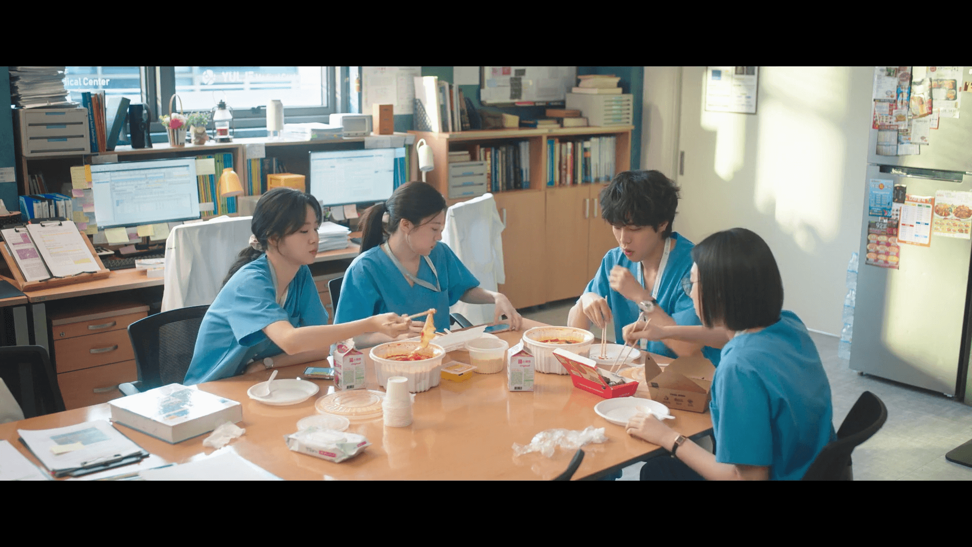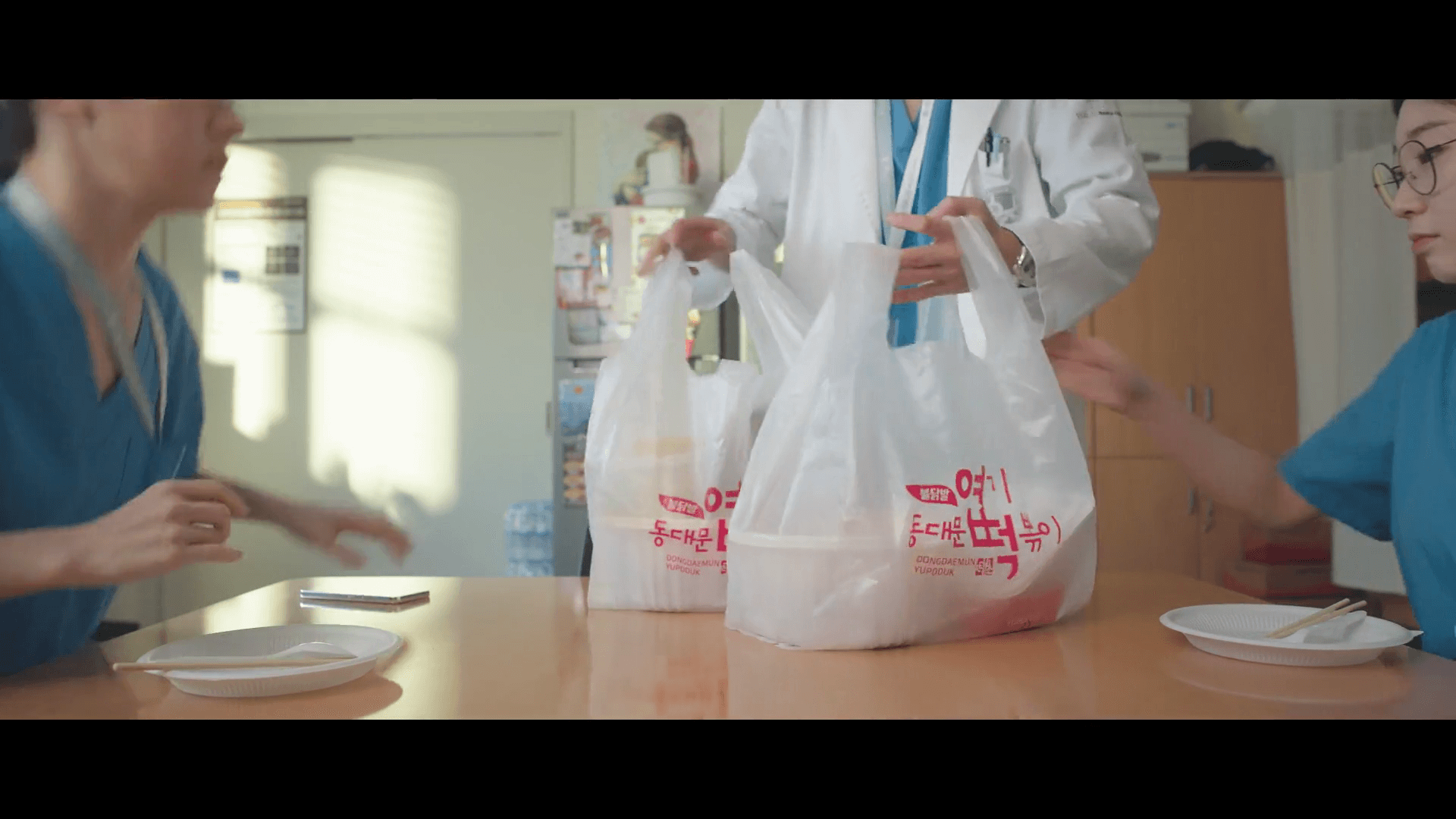 드라마 '언젠가는 슬기로운 전공의생활' 5화와 8화의 한 장면, 힘든 하루를 마무리하는 전공의 4인방의 소박하지만 행복한 야식 풍경이 담겨 있습니다. 땀 흘려 일한 뒤 먹는 야식은 그 어떤 진수성찬보다 달콤하죠. 특히 이미지에서 느껴지는 갓 배달된 따끈한 떡볶이 봉투와 먹기 좋게 치즈가 녹아내린 치즈 떡볶이의 비주얼은 시청자들의 침샘을 자극하기에 충분합니다.